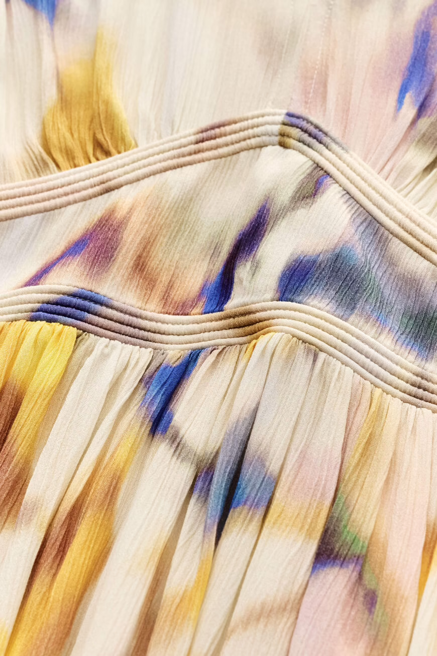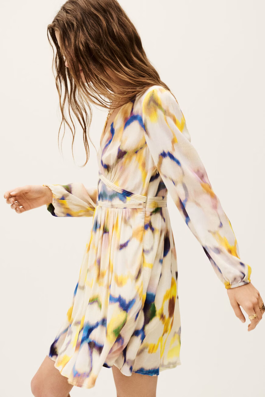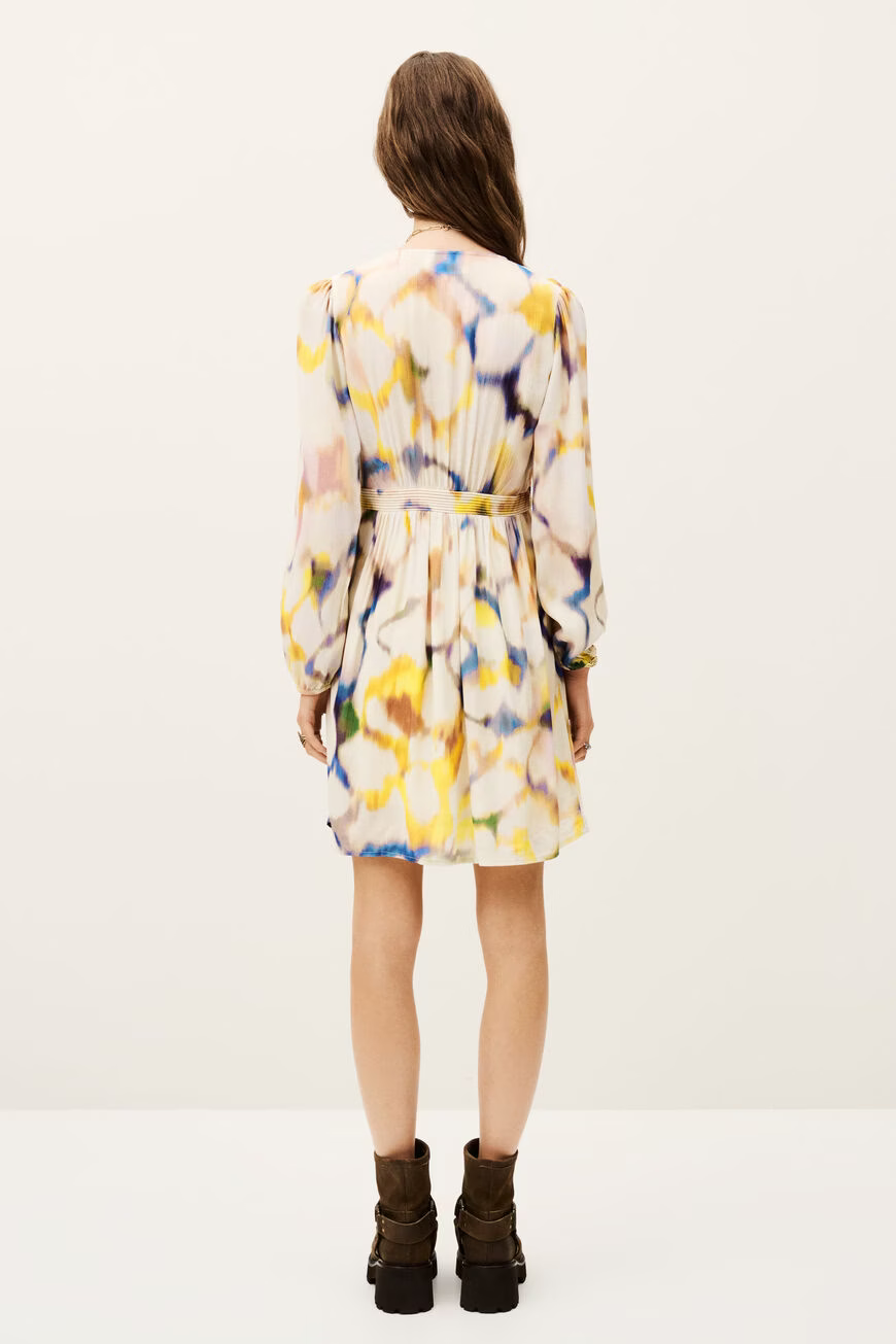 בגזרת מעטפת עם מפתח וי וכיווצים במותן. עשויה בד נשפך עם הדפס צבעוני.